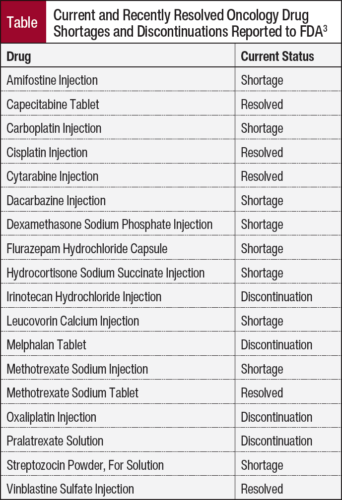 The FDA also monitors shortages and currently has 16 cancer drugs on their list of drug shortages (Table).3 The World Health Organization maintains a list of Essential Medicines that is updated every 2 years by the Expert Committee on Selection and Use of Essential Medicines, and 4 of the 20 essential cancer medicines are currently in shortage4: