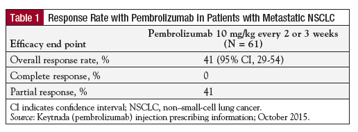 The approval of pembrolizumab for patients with PD-L1–expressing metastatic NSCLC was based on a subgroup analysis of 280 patients enrolled in the KEYNOTE-001 clinical trial, a multicenter, open-label, multicohort, activity-estimating study.9,10,13