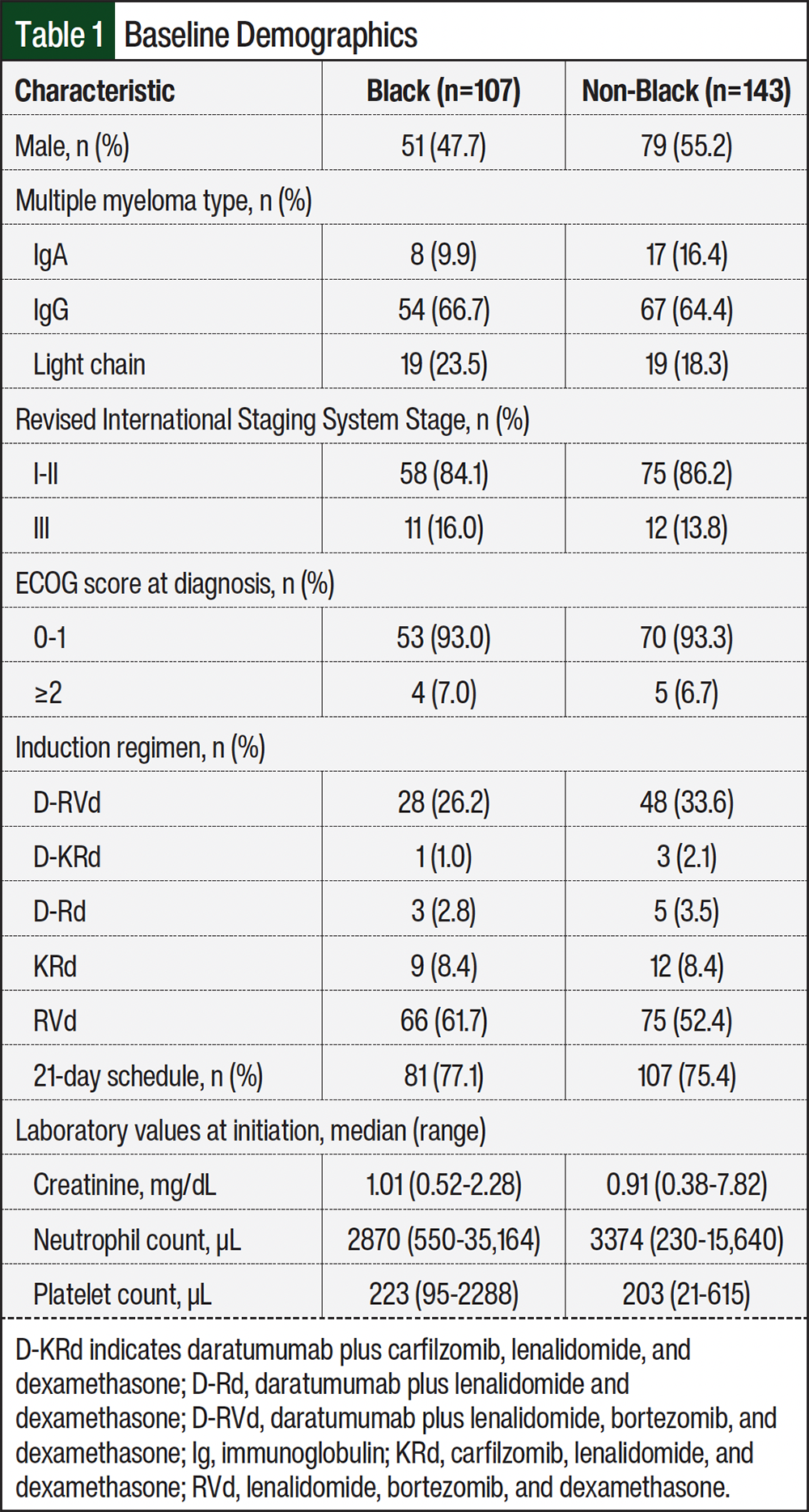 In all, 107 Black and 143 non-Black patients were identified and included in the analysis. Patients’ baseline characteristics are shown in Table 1 and are generally similar, except fewer Black men (47.7%) were included in the analysis compared with non-Black men (55.2%). Similar proportions of Black and non-Black patients had an ECOG score >1 and revised International Staging System stage III disease. The most common induction regimen was RVd (Black patients, 61.7%; non-Black patients, 52.4%), followed by daratumumab, lenalidomide, bortezomib, and dexamethasone (D-RVd; Black patients, 26.2%; non-Black patients, 33.6%). Most patients were initiated on 21-day cycles with 14 days of lenalidomide (Black patients, 77.1%; non-Black patients, 75.4%). This is consistent with guideline recommendations, population-based studies, and the demographics of the newly diagnosed MM population at Emory Healthcare.