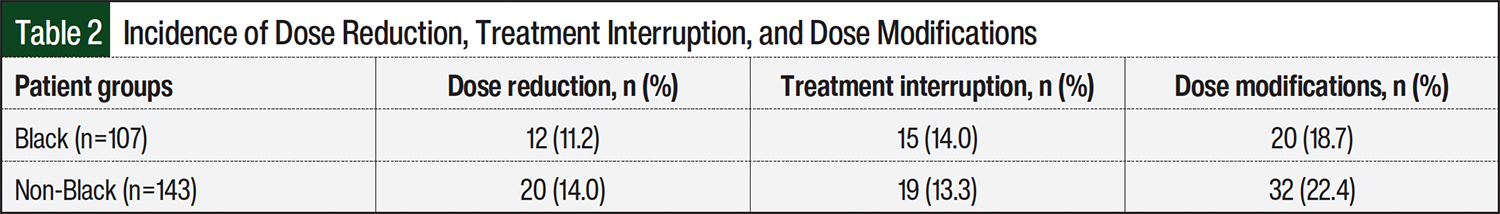 We analyzed the incidence of dose modifications experienced by patients in the Black and non-Black groups. Descriptive statistics were used to summarize the demographic and clinical data. Association between variables of interest and the race cohort were examined using ANOVA for numerical covariates and chi-square test for categorical covariates. Univariate logistic regression models were used to identify individual prognostic factors for dose modification. A P value of <.05 was considered statistically significant for all statistical analyses. Statistical analysis was conducted using SAS version 9.4 (Cary, NC) and SAS macros developed by Biostatistics and Shared Resource at Winship Cancer Institute.15
