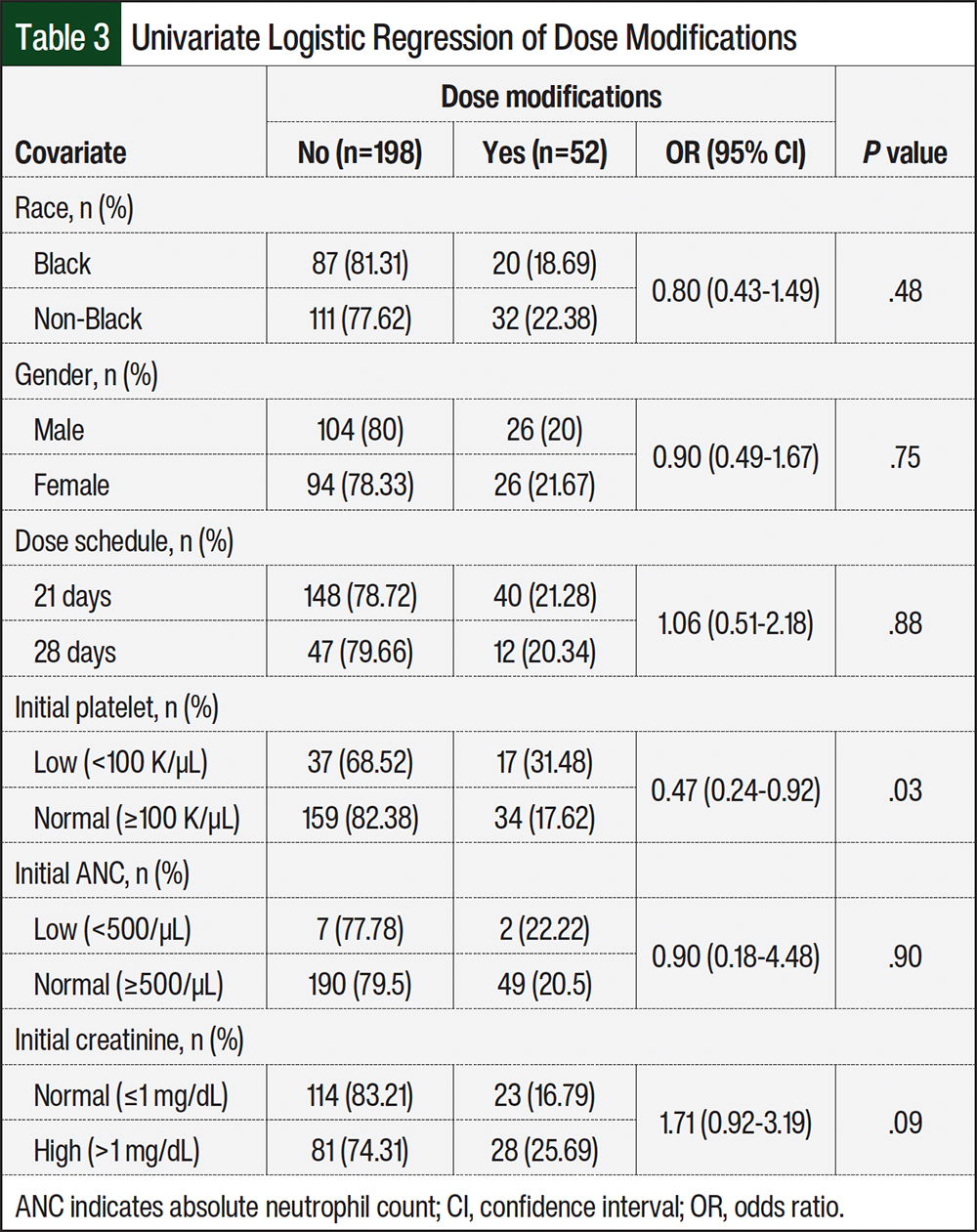 Through univariate logistic regression analysis, we found no significant association between Black race and an increased risk for dose modifications when compared with non-Black patients (odds ratio [OR], 0.80; 95% confidence interval [CI], 0.43-1.49; P=.48; Table 3). Conversely, patients with thrombocytopenia (platelet count <100,000) before lenalidomide initiation were more likely to require dose modifications (OR, 0.47; 95% CI, 0.24-0.92; P=.03). Other covariates, including gender, MM type and revised International Staging System stage of disease, and dose schedule were not found to be independently associated with risk for lenalidomide dose modifications. However, we observed that as baseline performance score worsens, the incidence of dose modifications increases, although this finding did not reach statistical significance for patients with ECOG scores >1 compared with those with ECOG scores of 0-1.