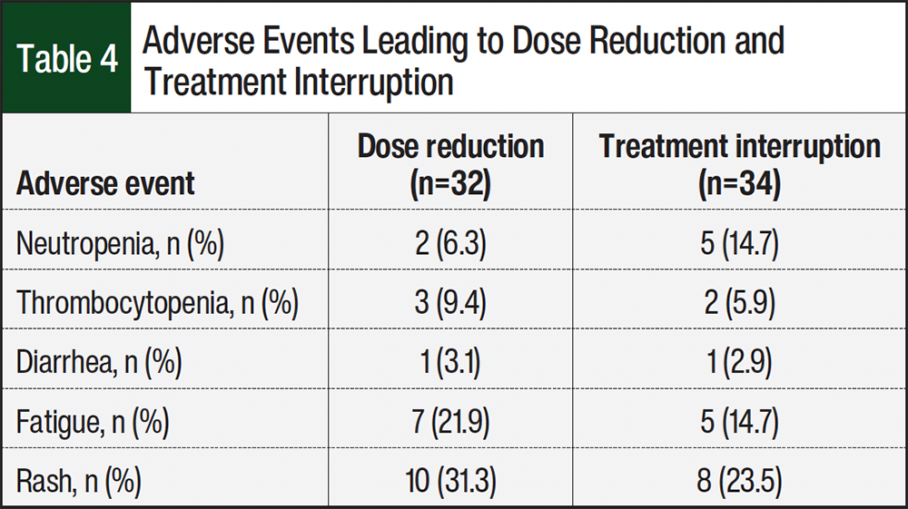 The most common AE leading to dose reductions and treatment interruption was rash (dose reduction, n=10 [31.3%]; treatment interruption, n=8 [23.5%]). Fatigue was the second most common reason for dose reduction (n=7 [21.9%]). Overall, hematologic AEs, including neutropenia or thrombocytopenia, requiring dose modifications in our study were low (n=12 [18.2%]) and frequently managed with treatment interruption (treatment interruption, n=7 [10.6%]; dose reduction, n=5 [7.6%]; Table 4). The observed incidence of neutropenia requiring dose modifications was lower than reported in other randomized trials.11,13,14 Future research should assess whether growth factor support was administered during induction treatment as well as grade of hematologic AE.
